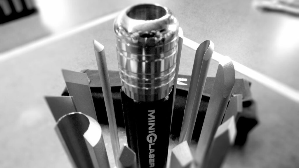 It consists of 9 tools encased in our worldwide patented adapter holding system, which is machined to extremely high tolerances. The handle serves as a unique holding device, which is totally new to the industry.